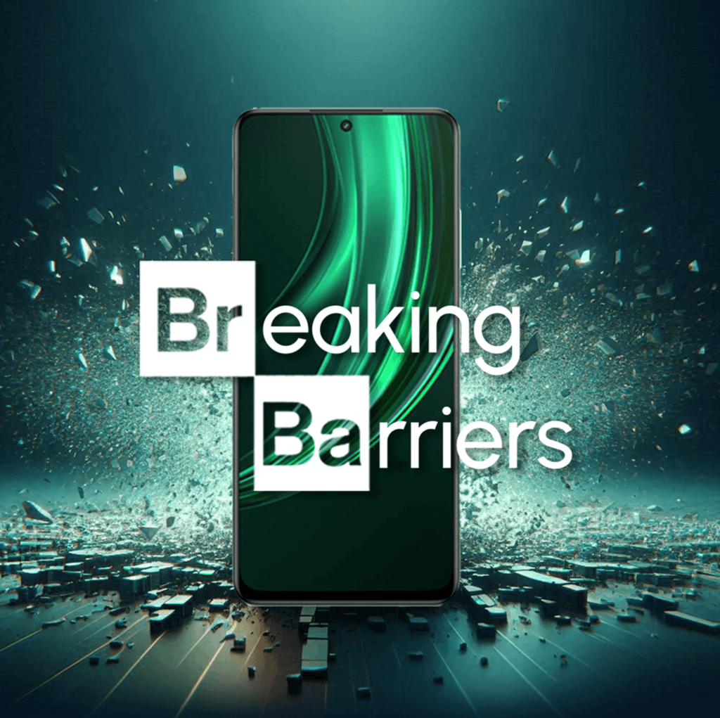 The hero visual represents the core idea. Barriers physically breaking apart around the device — a direct representation of the campaign concept.